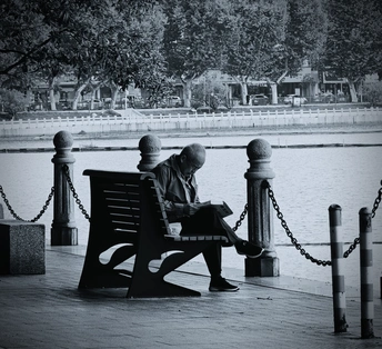 晨雾未散的湖畔,长椅上的老者正专心致志的阅读。他佝偻的脊背弯成时间的弧度,斑驳的手指轻抚书页的褶皱,老花镜片后藏着一整片宁静的湖。帆布鞋边散落的面包屑引来水鸟驻足,而老人早已潜入文字的海——那些印在纸上的黑字,时而化作游鱼跃入粼粼波光,时而变成候鸟飞越苍翠山峦。 秋日的银杏叶飘落成书签时,湖面正倒映着另一个宇宙:风翻动书页的簌簌声与湖水呼吸的节律渐渐重合,皱纹深处的智慧与千年湖泊的深沉在此刻达成契约。当夕阳为书脊镀上金边,合拢的书本里便封存了整片湖光的私语。 这帧影像捕捉了人类最古老的浪漫:在流动的世界里寻找永恒,在喧嚣的生命中守候寂静。老人读着手中的故事,湖水映着天地的故事,而我们,恰好途经了这场双向的凝视。