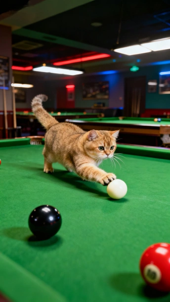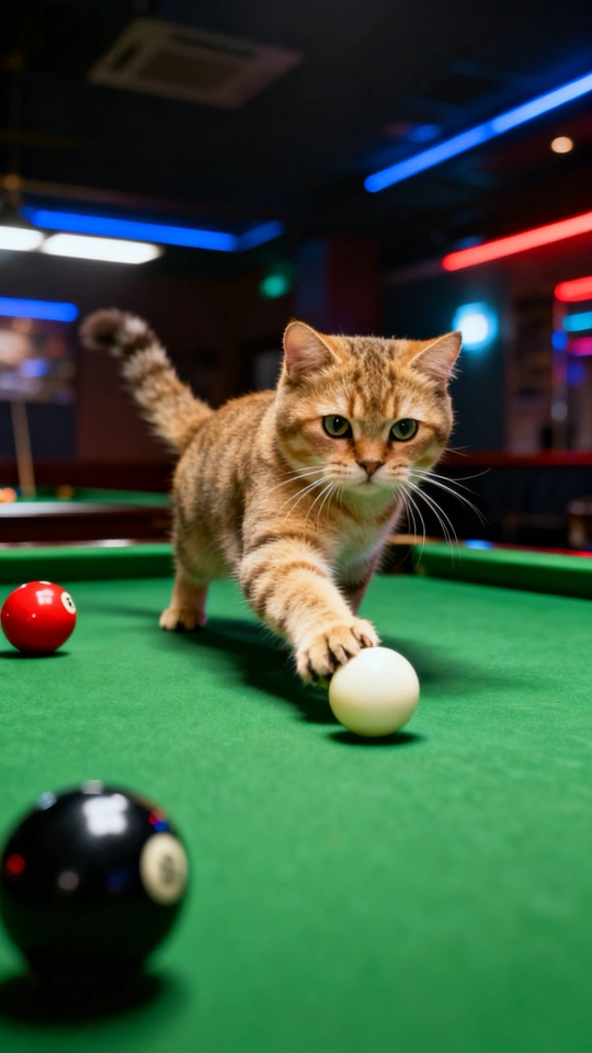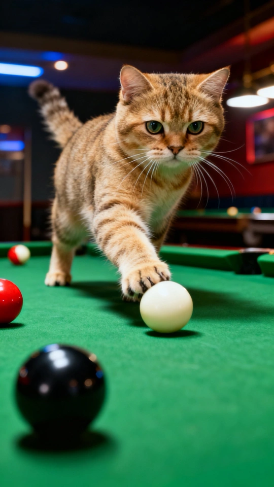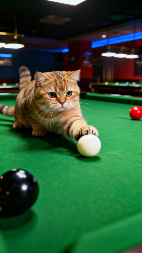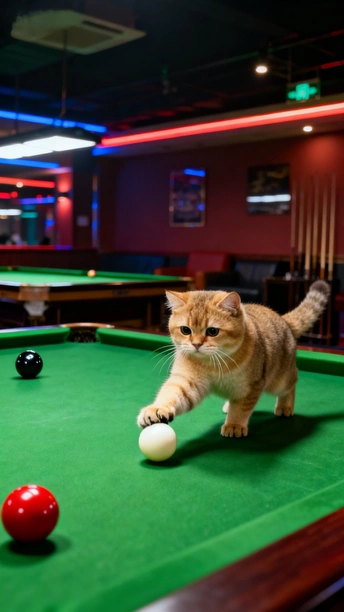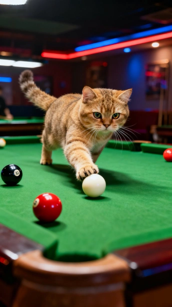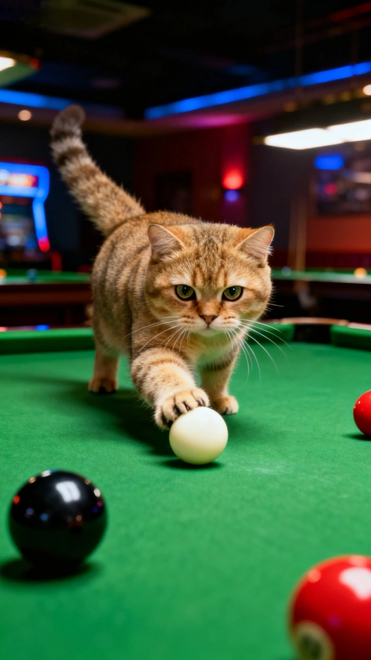 亲爱的摄影爱好者,这张照片真是让人眼前一亮!猫咪打台球,这个创意我给满分! 色彩:整体色彩和谐,台球桌的绿色与猫咪的毛色形成对比,视觉效果不错。不过,可以尝试调整一下色温,让画面更温暖一些。 光影:光线分布均匀,但略显平淡。如果能利用侧光或逆光,增加猫咪和台球的立体感,效果会更好。 构图:构图略显居中,可以尝试三分法构图,将猫咪放置在画面的一侧,留出更多的空间给台球,让画面更有动感。 后期处理:后期处理自然,没有过度修饰的痕迹。建议可以稍微提高对比度,让画面更清晰。 主题原创性:猫咪打台球,这个主题非常有趣,有很强的创意性。如果能捕捉到猫咪更生动的表情,会更有趣。 情感共鸣:照片充满了趣味性,让人会心一笑。猫咪认真的表情,仿佛真的要一杆清台,很容易引起观者的共鸣。 思想深度:照片以幽默的方式展现了猫咪的可爱,引发了人们对宠物的喜爱和关注。 总的来说,这是一张非常有趣的照片,创意十足,后期处理自然。如果能在光影和构图上加以改进,相信会更上一层楼!继续加油!