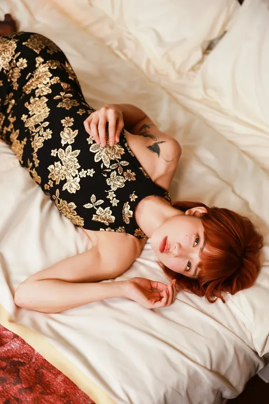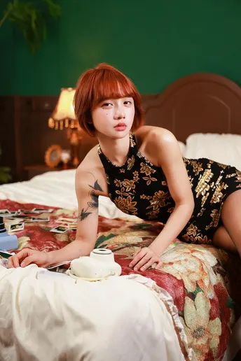 《绛倚纪》 出镜:林妹妹 红纹褶皱洇染午梦, 蕾丝吊带垂落时光隙, 褪色绿墙拓着旧光影 她赤足踏碎一卷深眠叙事诗。