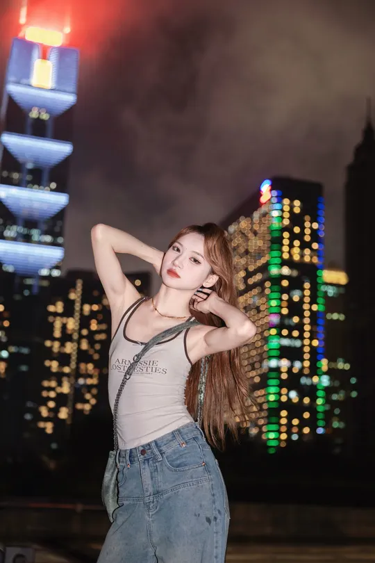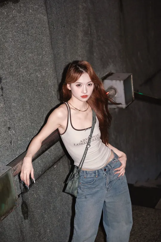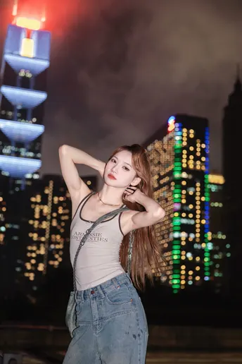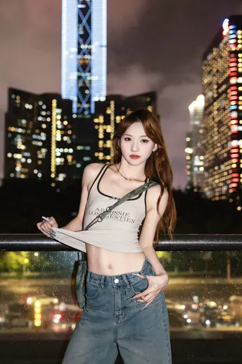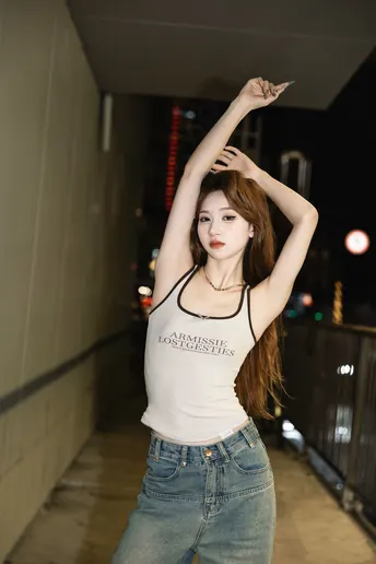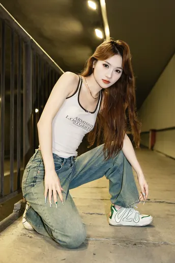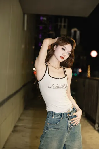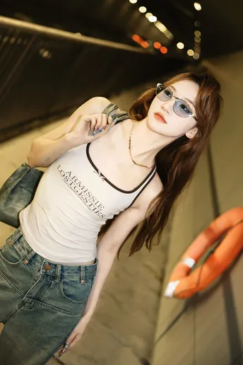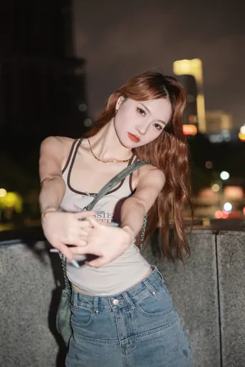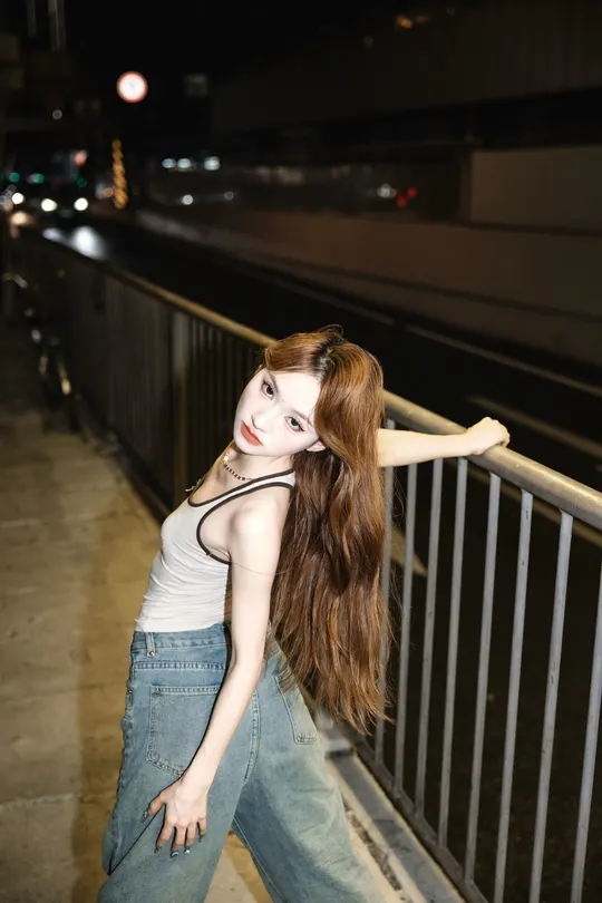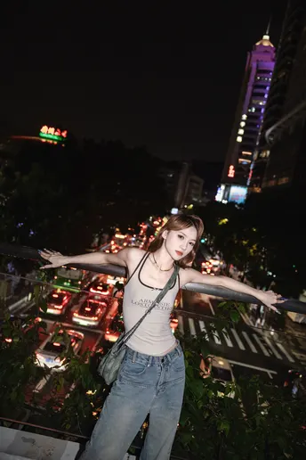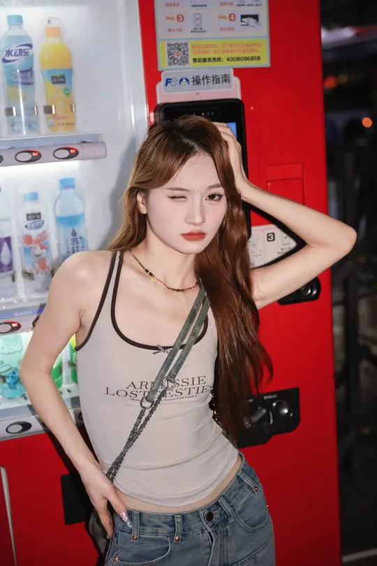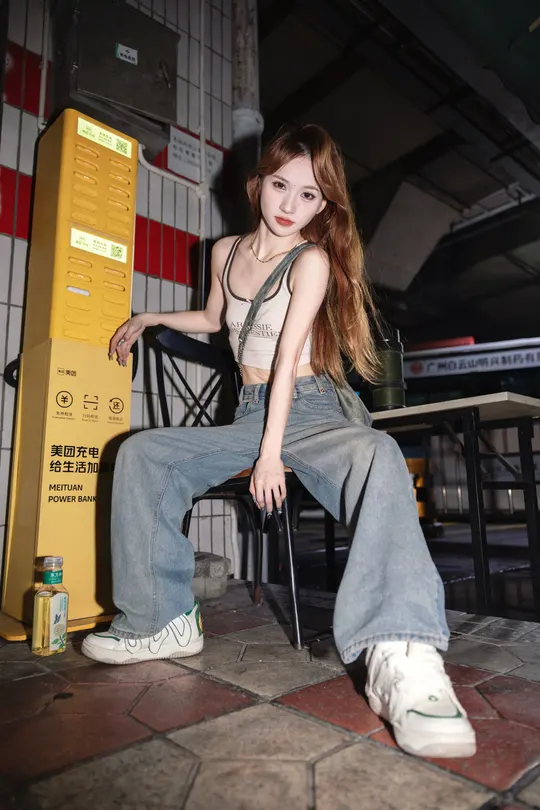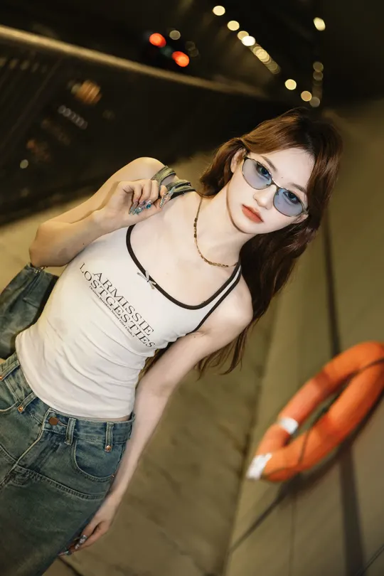 《都市夜行诗》 出镜:飘飘 白衫蓝裤拓印都市光影,她持镜倚栏拾取夜风,救生圈与售货机共谱霓虹诗,将时尚淬成街头密语。