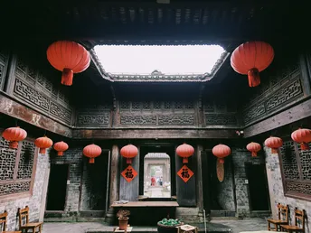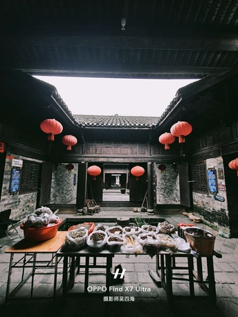 灰瓦青砖的古宅院落,被满院的红灯笼点燃了岁月的温度。那一个个红得热烈的灯笼,与门上的“福”字相映成趣,是年的符号,更是时光的印记。几位乡亲围坐桌前的忙碌身影,让这古宅不再只是历史的陈列,而是盛满了人间烟火的容器。旧建筑的沧桑与新民俗的鲜活在此交融,每一缕光影都在诉说:传统从未远去,它就藏在这灯笼的红、古宅的韵,和烟火日常的温度里。