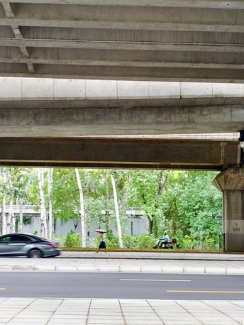 京密快速巨大的钢筋水泥桥墩下,车流、行人、绿植交织,勾勒出城市中建筑与生活的碰撞,展现出平凡角落的城市切片。