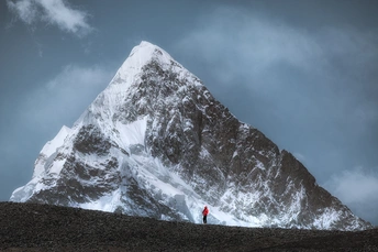 在库拉岗日的冷峻山影下,红衣身影与雪山不期而遇。风掠过砾石,他望着那终年不化的雪,时光在此刻,只余山的静穆与行的悠然。