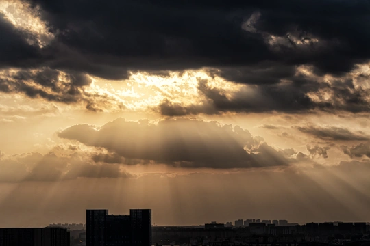 构图:张力与平衡的视觉诗学,画面以“乌云压顶-光束破云-城廓托底”构建三层叙事结构。厚重暗云如墨团铺展天际,形成压抑的视觉重量;中部云层撕裂处,金色光束呈放射状倾泻,如天神之手撕开夜幕,构成画面的情感爆点;下方城市剪影以几何线条横向延展,为灵动的云层提供稳定基底。暗云的流动曲线与光束的直线轨迹形成刚柔对抗,极小的城市尺度反衬天地之辽阔,在失衡中达成微妙平衡,仿佛整个宇宙都在这一刻屏息凝视。 色彩:明暗博弈的情绪场,作品以黑金两色构建极致对比:乌云的深灰近黑如命运的铁幕,光束的鎏金炽白似希望的火种,二者在云层边缘碰撞出“金边黑缎”的华丽质感。光线从核心的炽白渐变为外围的暖黄,再过渡到城市的朦胧灰褐,形成自然的色彩梯度。这种“黑暗越浓重,光明越耀眼”的视觉法则,暗合人类面对困境时的心理体验——压抑与释放、绝望与希望在此消彼长中达成情绪共振。 情感:逆境中的精神突围,画面最动人的是其隐喻力量:乌云象征生活中的困顿,光束则是突破桎梏的信念。当观者目光追随光线穿透云层、轻抚城市,会产生“困境终将消散”的心理暗示。这种情感并非直白说教,而是通过自然意象的戏剧化呈现——云层的厚重感强化了光束穿透感。