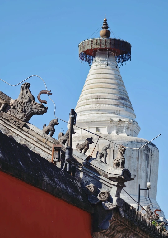 红墙檐角的脊兽与白塔相映,传统建筑的细节与宗教地标碰撞,在蓝天之下,诉说着古都北京的历史底蕴与文化传承。