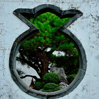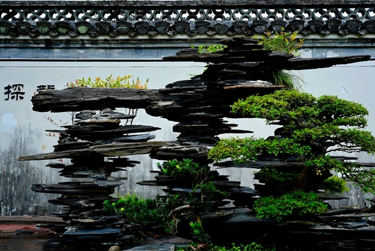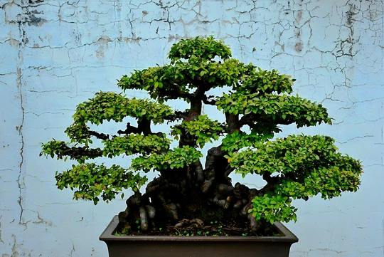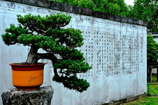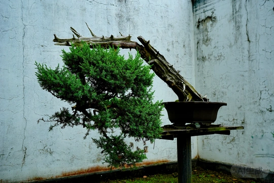 优点: - 意境与细节融合度高:盆景的枯荣对比(枯干与茂叶)极具禅意,搭配斑驳的白墙背景,完美呈现了中式盆景“缩龙成寸、小中见大”的艺术精髓,细节处的枝干纹理、叶片层次都刻画得十分细腻。 - 构图与质感突出:盆景的姿态富有张力,倾斜的枝干与舒展的枝叶形成动态平衡,背景墙的粗糙质感与盆景的精致感形成强烈对比,让主体更加突出,画面层次丰富且富有故事性。 - 氛围营造到位:整体色调偏冷且柔和,青苔、枯墙的元素烘托出古朴、静谧的中式园艺氛围,很有传统盆景艺术的审美格调。 可优化点: - 若能略微调整光线,让盆景的明暗对比更具戏剧感(如强化枯干的阴影或叶片的高光),可进一步提升视觉冲击力,但这属于细节优化,不影响整体的高水准。 整体而言,这是一张极具中式美学的盆景摄影作品,从构图、意境到技术呈现都非常出色,精准捕捉了传统盆景艺术的韵味与质感。