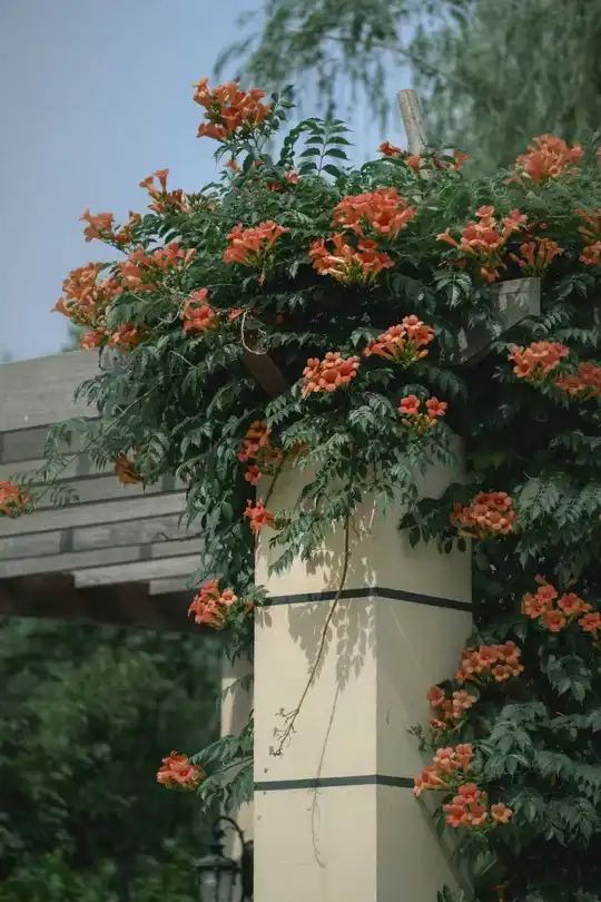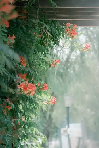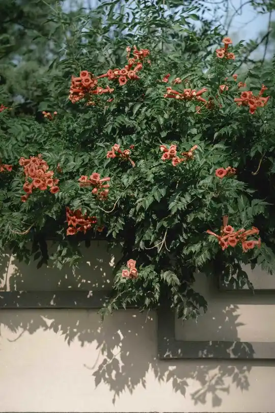 十月已至,凌霄花依旧盛放,攀援而上,是向上生长的勇气,也是冲破阻碍、向阳而生的执着。不同于夏日的热烈橙红,经历过酷暑和暴雨洗礼的凌霄花,与秋风共饮,透着一股看尽人间繁华的淡定和从容。这也是我喜欢它的一点。少年不惧岁月长,彼方尚有荣光在,色彩斑斓的秋天,依然绽放着最耀眼的中国红。