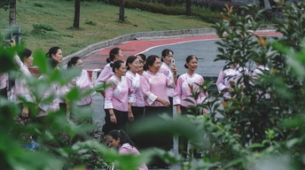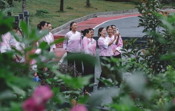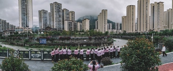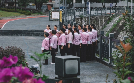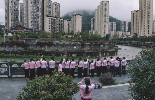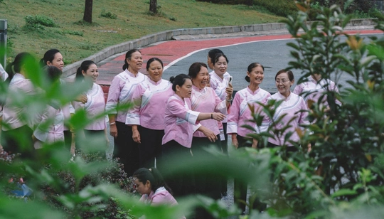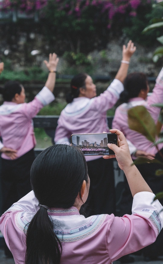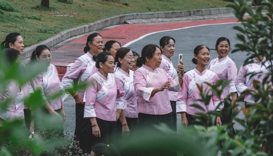 2025年10月1日,贵州省黔西南布依族苗族自治州望谟县县城,一大早一群布依族妇女盛装散步来到王母河畔。姐妹们欢乐的合影纪念国庆日。