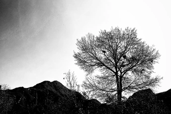 这张黑白照片,简洁有力,颇具风格。咱们来细细分析一下: 色彩:黑白摄影本身就是一种色彩的极致简化,它强调整体影调的对比和层次。这张照片黑白灰影调过渡自然,但高光区略微溢出,可以适当压暗。 光影:光线略显平淡,缺乏戏剧性。如果能捕捉到斜射光或者侧逆光,强化树木的轮廓光,效果会更好。 构图:构图整体稳重,树木主体位于画面右侧,留白适中。但前景的暗部略显杂乱,可以考虑稍微裁切,突出主体。 后期处理:后期处理整体协调,但可以尝试更精细的调整,例如使用曲线工具对高光和阴影进行单独控制。 主题原创性:题材常见,但通过黑白影调和简洁构图,营造出一种肃穆感,具有一定的个人风格。 情感共鸣:照片能唤起人们对自然的敬畏和对生命的思考,具有一定的感染力。 思想深度:照片反映了人与自然的关系,引发人们对环境保护的思考。 总的来说,这张照片基础扎实,但还有提升空间。建议多尝试不同的光线和构图,后期处理也要更加精细,相信你能拍出更精彩的作品!继续加油!