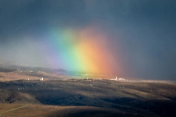 构图:天地间的七彩拱门,画面以彩虹为天然视觉中心,其半圆形弧线横跨天际,将画面分割为深蓝天幕与赭黄大地两部分,形成稳定的“上轻下重”结构。地平线处的低矮建筑群与起伏丘陵构成横向基底,反衬彩虹的灵动曲线。远景的朦胧山影增强纵深感,雨滴残留的镜头光斑为画面增添呼吸感,让自然奇观与人文痕迹达成微妙平衡。 色彩:混沌中的秩序之美,以深蓝灰为背景,彩虹的红、橙、黄、绿、蓝、靛、紫七色如色谱般精准排列,从外到内形成渐变韵律。乌云的墨蓝与彩虹的明丽形成强烈对比,大地的暖褐则中和了色彩的跳脱,让画面在热烈中不失沉稳。色彩的精妙在于“破与立”——打破单一色调的沉闷,又以自然秩序重组视觉和谐。 情感与主题:困境后的希望礼赞,彩虹穿透乌云的瞬间,传递出“风雨过后见彩虹”的普世情感。暗沉天幕象征生活的阴霾,七彩光带则是困境后的希望具象,观者能从中读出对“坚守”与“新生”的共鸣。主题超越自然现象,成为对生命韧性的隐喻——所有的晦暗时刻,终会被光与色彩温柔化解。 艺术价值:瞬间诗意的永恒定格,摄影师捕捉到彩虹最饱满的“决定性瞬间”,将转瞬即逝的天象转化为永恒的视觉符号。镜头光斑的偶然效果与彩虹的必然规律碰撞,精彩