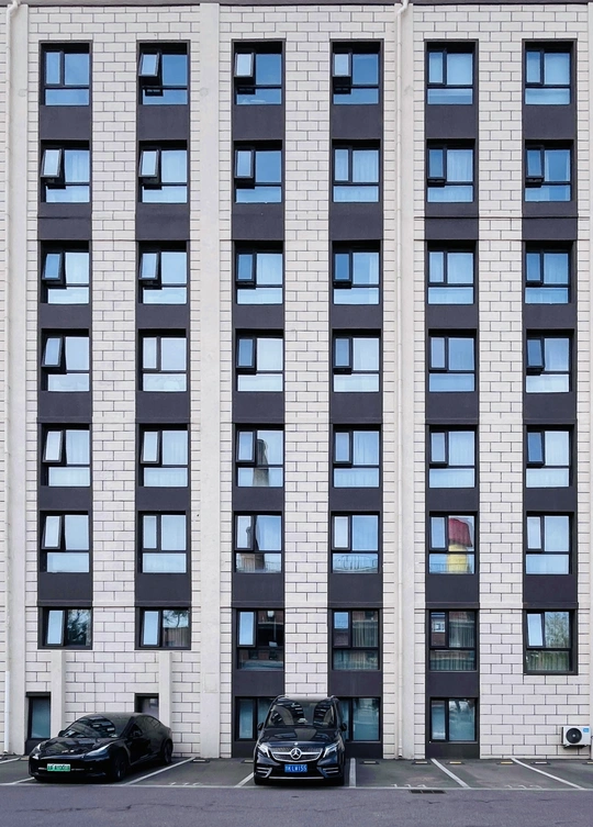 这张照片的建筑立面拍摄得较为工整,但还有一些提升空间。让我们逐一分析: 色彩:整体色彩偏冷,蓝色的窗户反射天空,与建筑的灰白色调形成对比,较为和谐。可以考虑稍微调整色温,增加一些暖色调,使画面更生动。 光影:光线较为均匀,缺少戏剧性。可以尝试在不同时段拍摄,捕捉更丰富的光影效果,比如日出或日落时分。 构图:对称构图较为规整,但略显呆板。建议尝试寻找更具创意的拍摄角度,例如,利用前景或侧面视角打破画面的单调。 后期处理:后期处理较为自然,但可以适当提高对比度,使建筑的线条更加清晰。 主题原创性:主题较为普通,缺乏新意。可以尝试从建筑的细节入手,或者结合人文元素,赋予照片更深刻的内涵。 情感共鸣:照片较为平淡,难以引起观者的情感共鸣。建议尝试通过光影、色彩或构图,营造更具情感氛围的画面。 思想深度:照片缺乏思想深度,未能引发观者的思考。建议尝试从建筑的历史、文化或社会意义入手,赋予照片更深刻的内涵。 总的来说,这张照片具备一定的摄影基础,但在创意、光影和情感表达方面仍有提升空间。加油!
