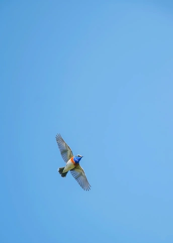靛颏鸟振翅高飞在阳光下闪耀着宝石般的光泽。它掠过山林与田野,歌声清脆悠扬,回荡在山谷间。轻盈的身姿穿梭于树梢与云间,仿佛一抹灵动的蓝色精灵,自由而灵秀。