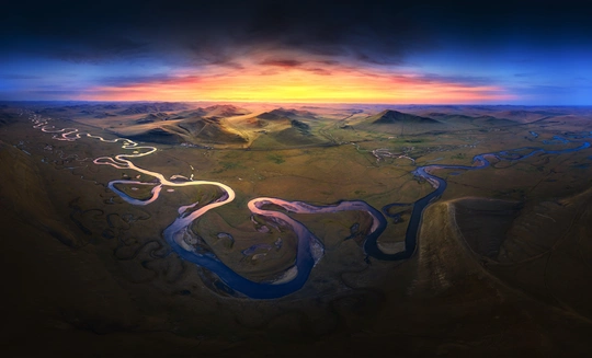 蜿蜒曲折的莫日格勒河,在清晨的朝霞下宛如一条彩色的丝带,是大草原最美的配饰。
