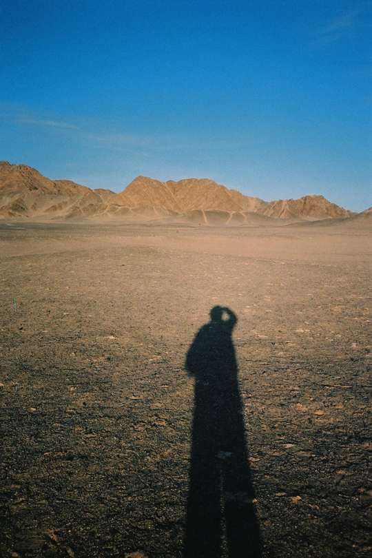 在广袤无垠的荒漠之上,干燥的沙石铺陈出岁月的沧桑。太阳正处于天地的边缘,将一个人的影子长长地投射在地面。那影,仿佛是时光的使者,带着一种静谧的力量,在这寂静的天地间,做着影之眺望。 拍摄时间:2025年3月26日 拍摄地点:青海黑独山 拍摄器材:柯尼卡bigmini a4 胶卷:巨星200 扫描仪:sp3000