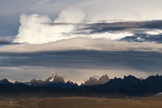 构图:天地交响的层次美学,画面以“三叠式”构图构建纵深:近景的苍茫草原铺展如毯,中景的雪山群峰以锯齿状轮廓刺破天际,远景的云层则以流动的棉絮状与条状交织,形成“地-山-云”的垂直秩序。主峰积雪的尖顶恰好处于黄金分割点,成为视觉锚点;云层的横向延展与山体的纵向耸立形成动态平衡,留白处赋予画面呼吸感,仿佛天地正在进行无声的对话。 色彩:黑白灰中的神性光韵,以墨蓝、苍灰、乳白构建极简色调:云层受光面泛着珍珠白,背光面沉为靛蓝,如巨大的羽翼覆盖山峦;雪山峰顶的残雪在天光下闪烁冷白,山体则融于深灰的阴影,仅在山坳处透出一丝暖金的霞光。色彩的克制让画面更显肃穆,却在黑白灰的渐变中,让每一缕光都成为神性的隐喻。 情感:敬畏与渺小的双重叩问,云层的磅礴与雪山的巍峨传递出强烈的崇高感,观者在凝视时会自然生发出对自然的敬畏;而草原的辽阔与远山的剪影,则反衬出人类的渺小。这种“宏大与细微”的对比,触动内心深处对“存在”的思考——在天地大美面前,所有的烦恼都变得轻盈,唯有对自然的谦卑与感动沉淀下来。 主题:永恒与变迁的时空哲思,作品以雪山象征永恒,云层象征变迁,草原象征生命