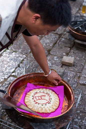 小时候你是不是也这样捧着小脸,期待着长辈分月饼? 中秋到,丽江古城四方街,居民游客一起打月饼,现做现烤现吃的纳西大月饼,美味无边