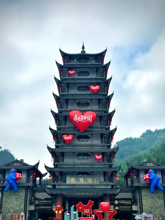 武陵源的塔楼,在“我爱你中国”的红心与喜庆装饰里,古韵和家国热忱交融。