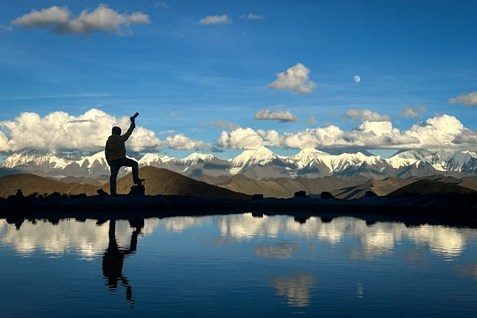 构图:天地人的对称交响,以“水平中线”分割画面,上半部是雪山、云层与悬月构成的壮丽天穹,下半部湖水如镜,将天空与人物倒影完美复刻,形成“现实-镜像”的对称美学。人物立于前景山巅,单腿蹬石、右臂高举的姿态构成黄金三角,与远处连绵雪山形成“近景动态-远景静穆”的平衡,手中相机成为连接人与自然的视觉锚点。 色彩:高饱和的生命力场,宝蓝天空与雪白云层形成强烈冷暖对比,雪山的银白与山体的赭石色过渡自然,湖面的靛蓝则沉淀了所有光影。人物剪影的深棕与环境色和谐相融,而空中的淡月如点睛之笔,在高饱和色调中注入一丝清冷,整体色彩如生命力的调色盘,热烈而不失庄严。 情感:征服与敬畏的共生,人物振臂欢呼的剪影传递出征服自然的豪迈,而渺小身影与磅礴山水的对比又暗含对天地的敬畏。镜像倒影则强化了“人与自然对话”的诗意,观者能感受到登顶时的狂喜与面对大美时的谦卑,这种复杂情感让画面超越单纯的“打卡照”,成为精神力量的视觉投射。 主题:个体与永恒的相遇,作品以“人-山-月”为核心意象,探讨短暂生命与永恒自然的关系。人物手中的相机是记录的工具,更是对话的媒介;悬月象征时间的永恒,而流动的云与波光暗示生命瞬息。
