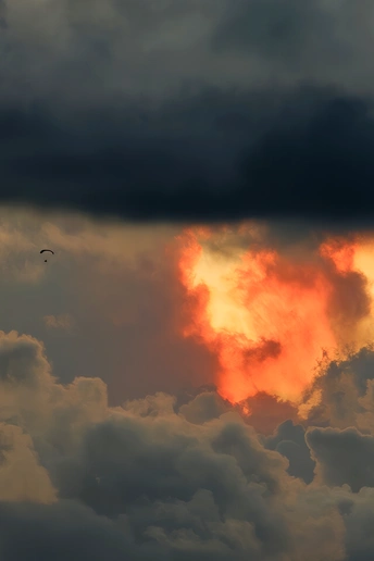 滑翔伞在烈焰云霞与沉郁云涛间穿行,似勇者挑战天地,在极限游戏中诠释无畏与自由。