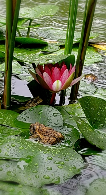 受睡莲声名远播所吸引,月宫蟾蜍不甘寂寞,腾云驾雾慕名而至,一睹其芳容神韵而惊叹不止,鸣赞不已……