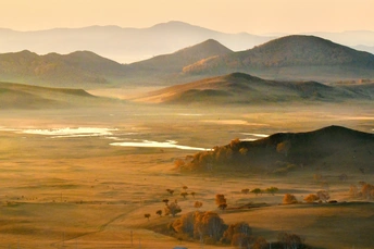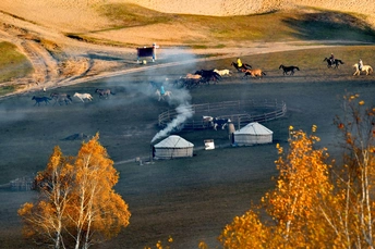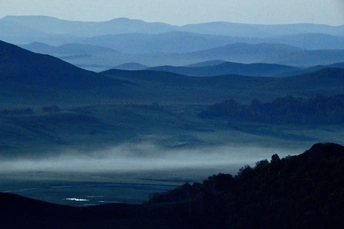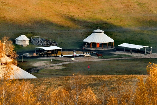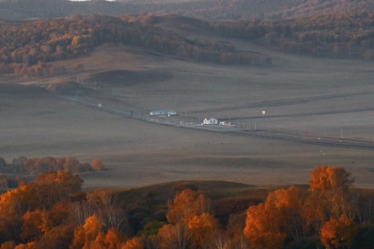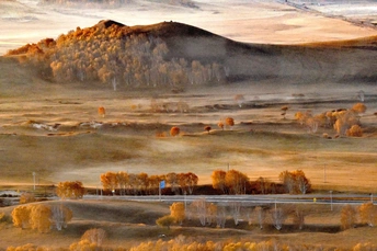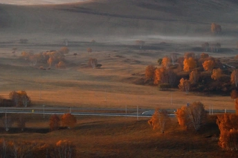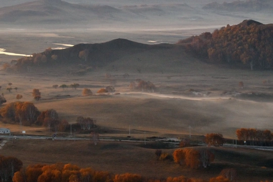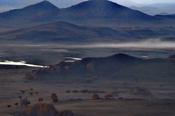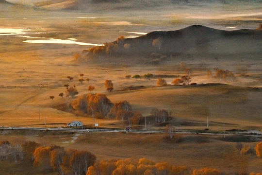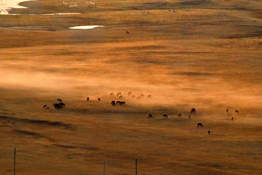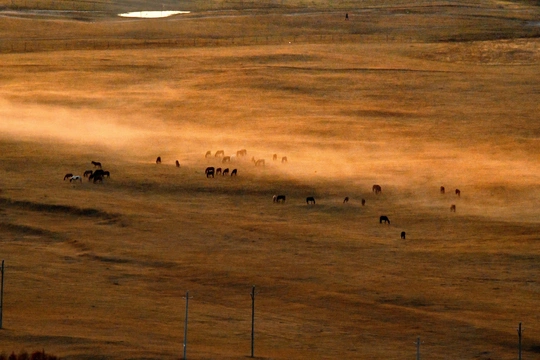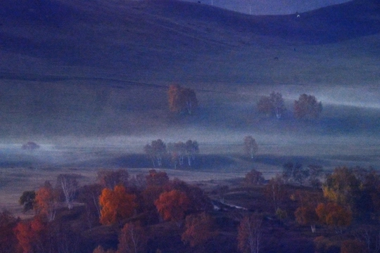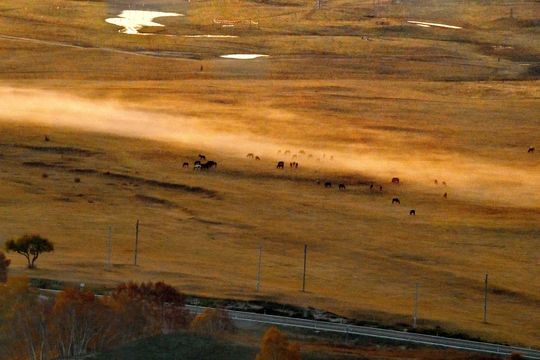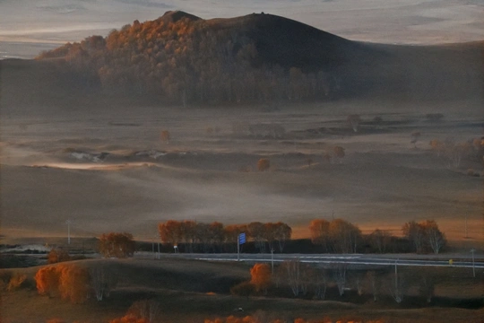 远山,中湖,近树层次分明,日出斜阳树影,山影深,平流雾点缀其中,若隐若现使画面起到点睛之意。弱光之中马群使画面更具灵动的效果,赏心悦目。