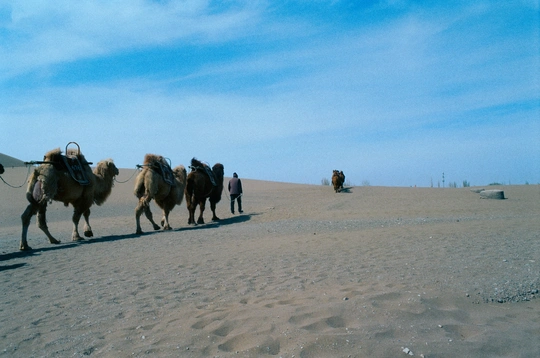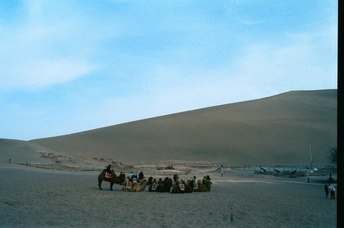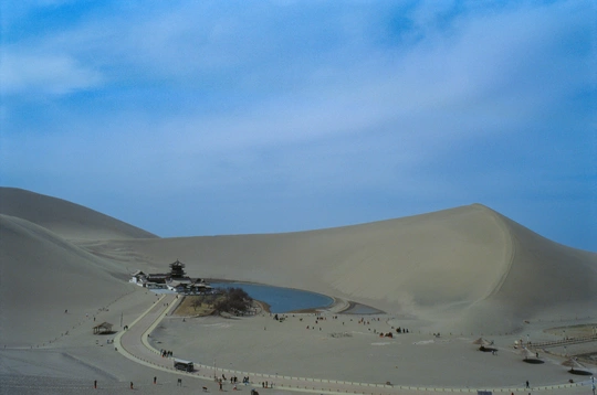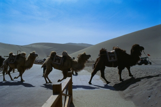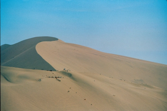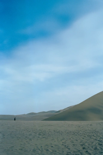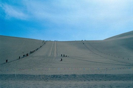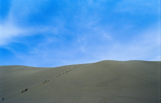 鸣沙山之境,广袤沙丘铺展眼前。湛蓝天空下,阳光倾洒,一片明媚。一条木质简易阶梯自前景蜿蜒至沙丘之巅,众多游人正拾级而上。前方一人身着鲜艳红衫与橙色长裤,背向镜头稳步前行。细腻沙丘之上,脚印错落,尽显人类活动踪迹。远处,更多身影或攀登或漫步。右侧彩色小旗带随风轻扬,为这方天地添了几分灵动。此般景致,尽显自然与人文和谐交融之美。 拍摄时间:2025年3月28日 拍摄地点:敦煌鸣沙山 拍摄器材:奥林巴斯om4 om28 f2.8 胶卷:柯达e100 扫描仪:sp3000