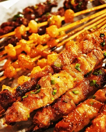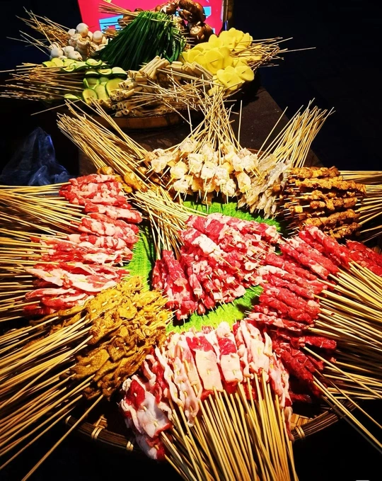 这张照片以烤串为主题,色彩鲜艳,食物的质感表现得很好,让人食欲大增。从构图上看,放射状的排列方式突出了烤串的多样性,并且引导观众的视线中心。光线运用得当,虽然环境光可能不足,但主体部分的亮度足够,细节清晰可见。拍摄者捕捉到了食物新鲜诱人的一面,记录了街头美食的特色。如果能更注意背景的简洁性,避免杂乱的背景元素,作品会更上一层楼。总的来说,这是一张不错的食物摄影作品,具有一定的吸引力。