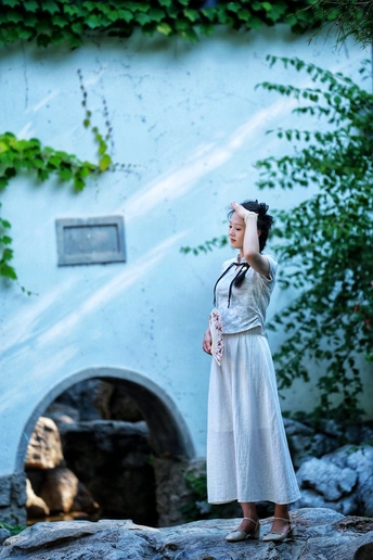 这张照片整体感觉清新淡雅,很有意境。下面我来细细点评一番,也给摄影爱好者一些提升的建议: 色彩:整体色调偏冷,蓝色的墙面和绿色的植物搭配,显得很清新。不过,色彩略显平淡,可以考虑在后期稍微增加一些对比度和饱和度,让色彩更鲜明。 光影:光线比较柔和,但是人物面部略显阴影,可以考虑使用反光板或者补光灯,让面部光线更均匀。 构图:构图整体不错,人物放在画面右侧,符合三分法原则。但是,背景元素略显杂乱,可以尝试调整拍摄角度,让背景更简洁。 后期处理:后期处理整体比较自然,但是可以适当调整一下对比度和清晰度,让照片更锐利。 主题原创性:主题比较常见,是比较典型的古风人像。可以考虑加入一些更独特的元素,让照片更有个性。 情感共鸣:照片传达出一种恬静、淡雅的情感,能够引起观者的共鸣。 思想深度:照片的思想深度略显不足,可以考虑通过人物的姿态、表情,或者背景的元素,来表达更深层次的思想。 总的来说,这张照片还不错,但是还有一些提升空间。希望摄影爱好者能够继续努力,拍出更优秀的作品!