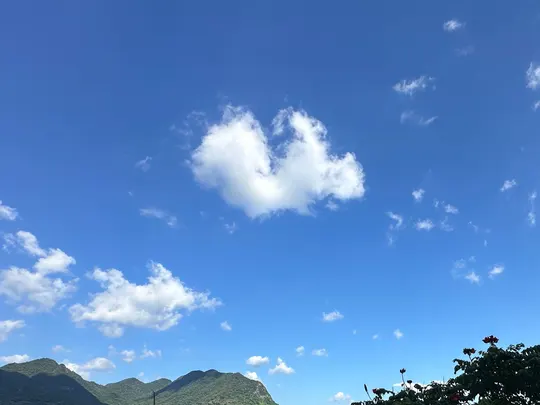 澄澈的蓝天,一朵心型云轻轻悬在山尖,像给青黛色的山峦别了枚柔软的徽章。