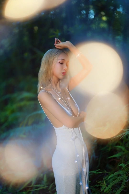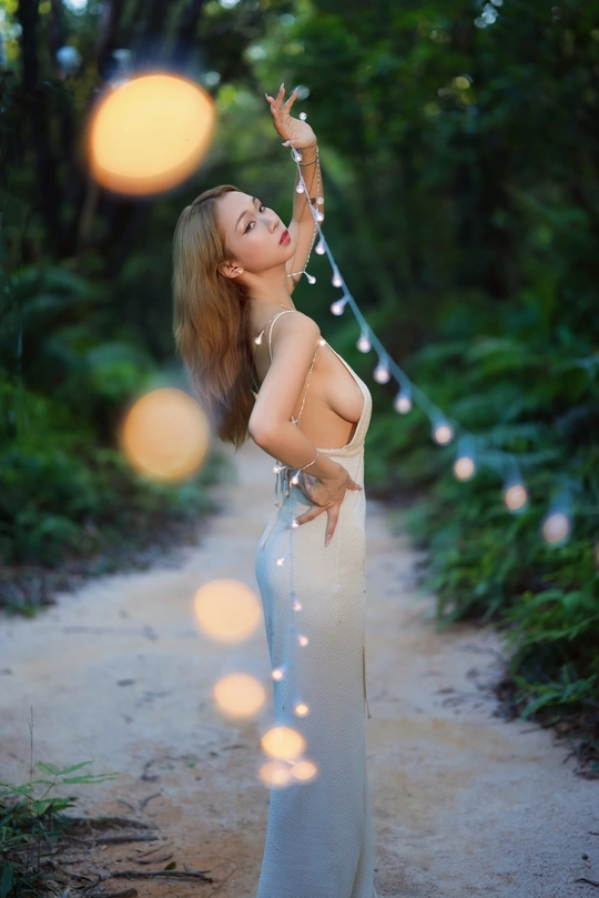 在葱郁林间,灯串如梦的碎片缀满时光,她是秘境里的造梦者,让每一缕光斑都成了森林的私语,在绿野深处织就一场关于光与美的迷幻长梦。