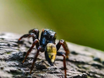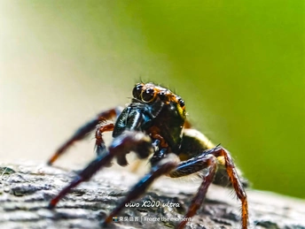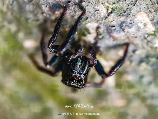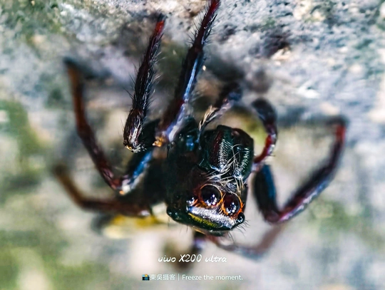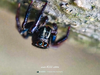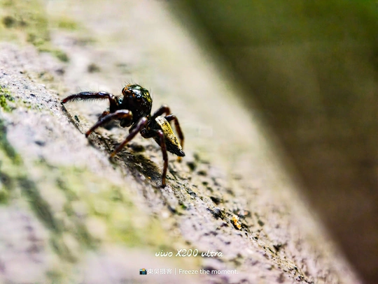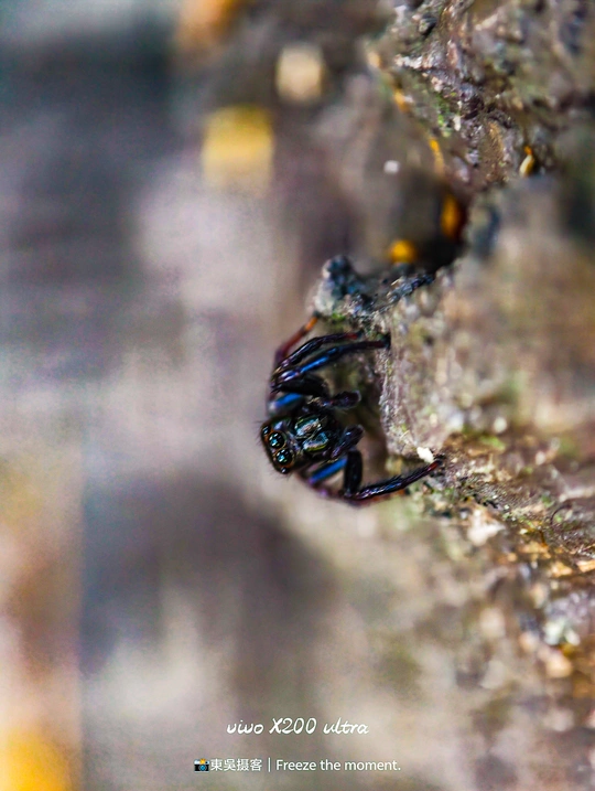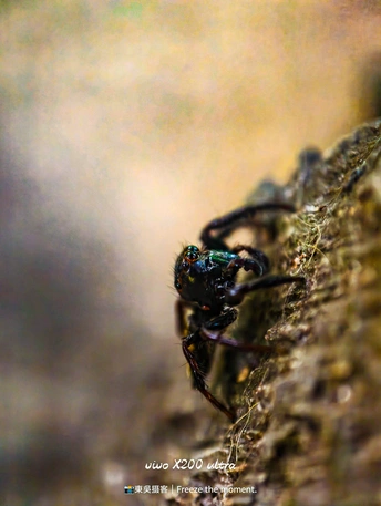 在微观世界里,这只跳蛛是绝对的主角。它有着如宝石般的复眼,在斑驳的树皮上穿梭,每一步都透着灵动。vivo X200 ultra 定格下它的每一个瞬间,让我们得以窥见这小小生命的精彩,原来平凡角落也藏着如此震撼的美。