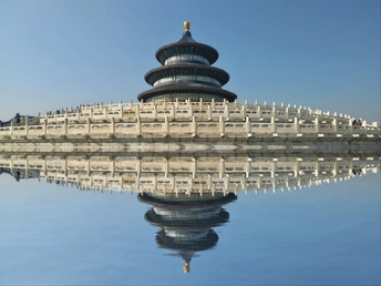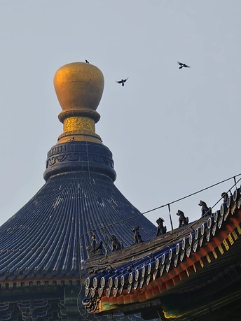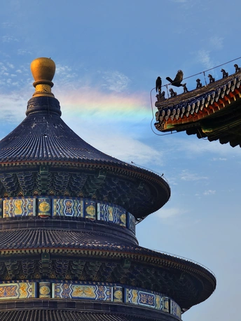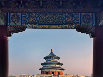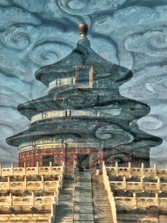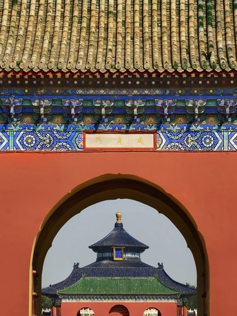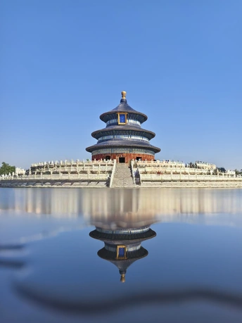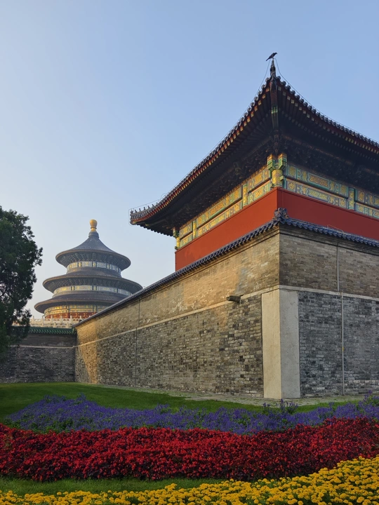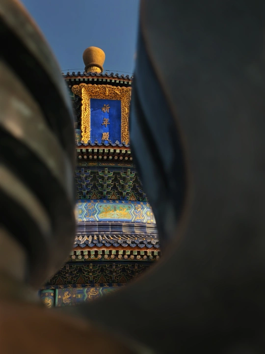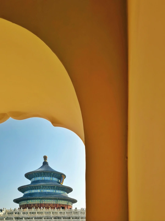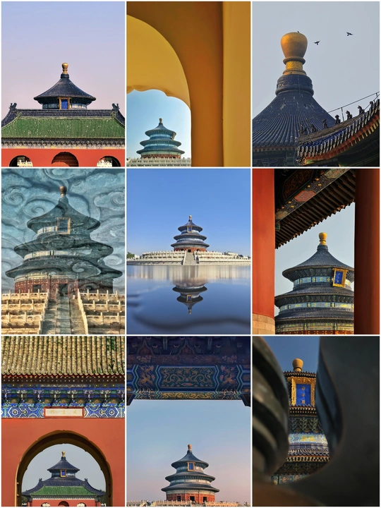 祈年殿的机位美学:450字解码建筑神韵 祈年殿的镜头语言,是一场建筑与光影的对话。特写金顶位聚焦鎏金宝顶与蓝瓦飞檐,檐角神兽伴飞鸟掠过,在毫厘间尽显皇家坛庙的工艺精度,一瓦一兽皆藏礼制匠心。 框景艺术有双重表达:明黄拱门作框,祈年殿成画中景,几何线条与层叠飞檐交织出秩序感;朱红门洞为幕,以红墙的厚重衬殿宇的精巧,在“框限”中演绎空间叙事的张力。 水墨创意位以虚实水墨融合云纹与殿宇,打破写实边界,让古建筑在镜头下漾起诗意朦胧,重构东方美学的空灵意境。镜面倒影位借水面镜像,使祈年殿虚实对称,蓝天、水波与建筑共鸣,诠释“天圆地方”的哲学意象。 夹缝透视位于红柱檐角间取景,以局部构件为前景拉伸视觉纵深,明暗线条交错出“藏露相生”的韵味;彩绘细节位则让斑斓斗拱与殿宇主体呼应,在龙纹彩绘里解码艺术与建筑的共生之美。 全景大气位收尽祈年殿全貌,汉白玉台基、层叠飞檐在蓝天之下铺陈出“敬天祀谷”的恢弘,让建筑的神圣气场一览无余。从微观到宏观,从具象到创意,每个机位都是对祈年殿灵魂的独特注解。