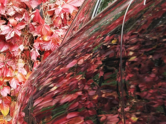 停靠在墙边的汽车,车身上映射出美丽的秋色,仿佛进入童话世界