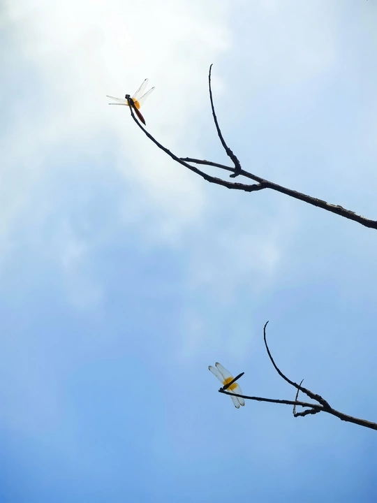 一抬头,看到树枝上停着蜻蜓。