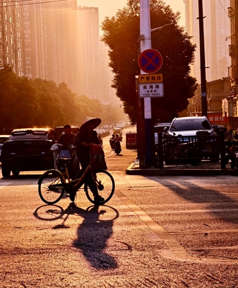 夕阳把马路熬成蜜色糖浆, 她骑着单车, 像蘸着光的笔尖, 在城市的稿纸上 缓缓移动。 影子被拉得很长, 长过了“严管路段”的标识, 长过了车流的喧嚣, 在柏油路上 拓印出 生活的慢板与重量。 楼宇在远处发着暖光, 而她的车轮, 正把这黄昏的甜, 碾进每一道 岁月的辙痕里。