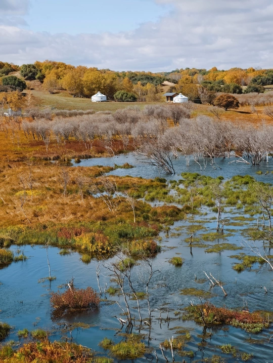 当秋意漫过坝上的原野,这片土地便成了大自然最慷慨的调色师。澄澈的湖水如镜面,倒映着金黄、橙红与苍绿的斑斓,枯木在水中舒展枝桠,似是在与流水共舞。远处的蒙古包静静伫立,在层林尽染的背景下,晕染出游牧文明的悠远诗意。 坝上的秋,从不是单一的色调。它是草场褪去翠绿后的暖棕,是桦树叶在秋风里晕开的金橘,是灌木丛燃烧般的绯红,更是湖水那抹澄澈的蓝,将所有色彩温柔收纳。每一处纹理、每一层色彩,都在诉说着季节的更迭与土地的深情。这里没有城市的喧嚣,只有风掠过草甸、掠过湖面的轻响,还有那蒙古包承载的游牧故事,在秋的调色盘里,绘就成一首关于自然与人文的交响诗,让每一个驻足的人,都能在这斑斓里,读懂坝上秋天的浪漫与辽阔。