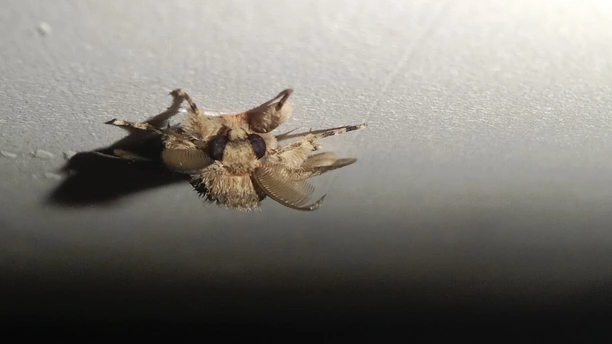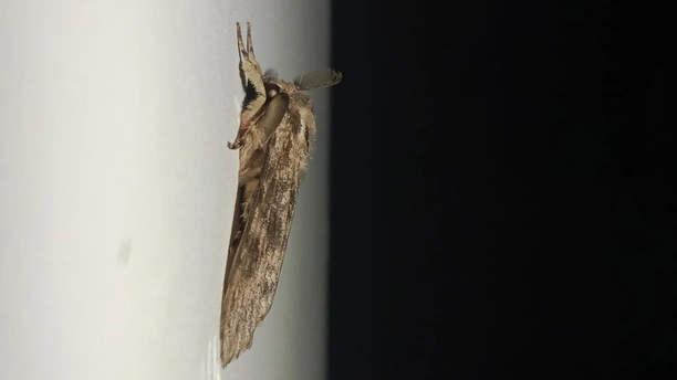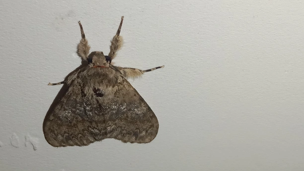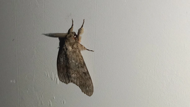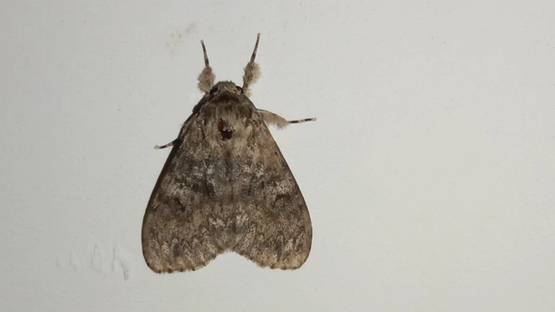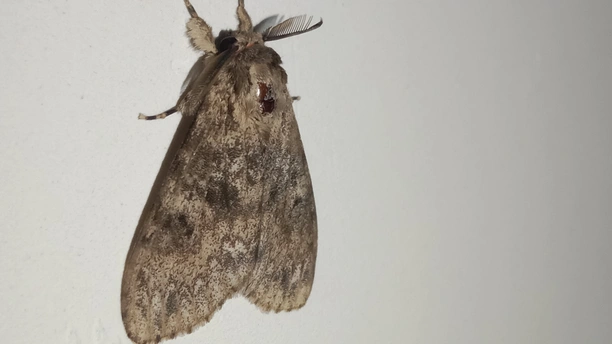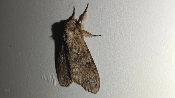 <放大小> 介绍一下 (夜晚,出来行动,白天,不出行动,翅膀中灰色的,眼睛灰色的,下面有一个中心点,黑色,有毒的,小心点,别用手去摸哦,中心点,黑色,这叫中文毒,会散开有毒气体哦) 巛 别名:秋千毛虫,苹果毒蛾、柿毛虫 中心点/中文毒:散开毒气体哦 天敌:鸟类、蜘蛛、姬蜂等 食物:苹果、柿、梨等 科:舞毒