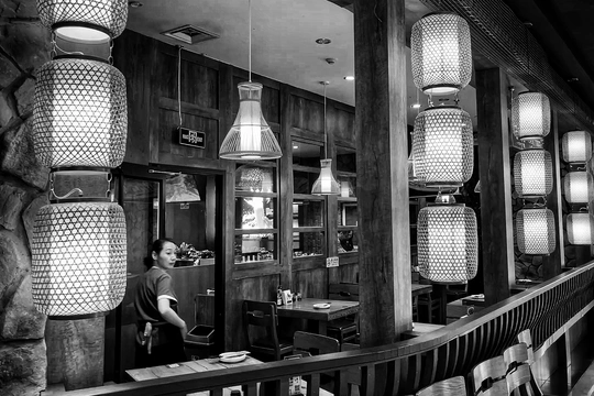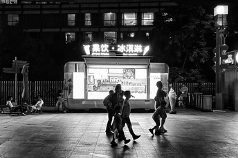 图一这张黑白照片捕捉了夜幕下街头的一角,小吃摊前人来人往,颇有生活气息。咱们来细细品评一番: * **色彩**:黑白影调统一,去除了色彩干扰,更专注于光影和线条的表现力。不过,灰阶层次略显不足,可以尝试在后期增加对比度,让黑更黑,白更白。 * **光影**:小吃摊的灯光是主要光源,照亮了前景的人物,形成明暗对比。但整体光线比较平,缺乏戏剧性。下次可以尝试寻找更具角度的光线,或者利用自然光创造更有趣的光影效果。 * **构图**:构图略显平淡,主体不够突出。可以尝试利用三分法或引导线,将观者的视线引向主体。另外,前景的人物略显杂乱,可以尝试调整拍摄角度或等待更简洁的画面。 * **后期处理**:后期处理整体感觉比较干净,但对比度可以再加强一些,让画面更具冲击力。注意不要过度锐化,以免出现噪点。 * **主题原创性**:街头摄影的题材比较常见,但这张照片捕捉了夜市的喧嚣和人情味。可以尝试寻找更独特的视角,或者在平凡的场景中发现不平凡的细节。 * **情感共鸣**:照片传递出一种市井生活的真实感,能够引起观者的共鸣。但情感表达可以更深入一些。