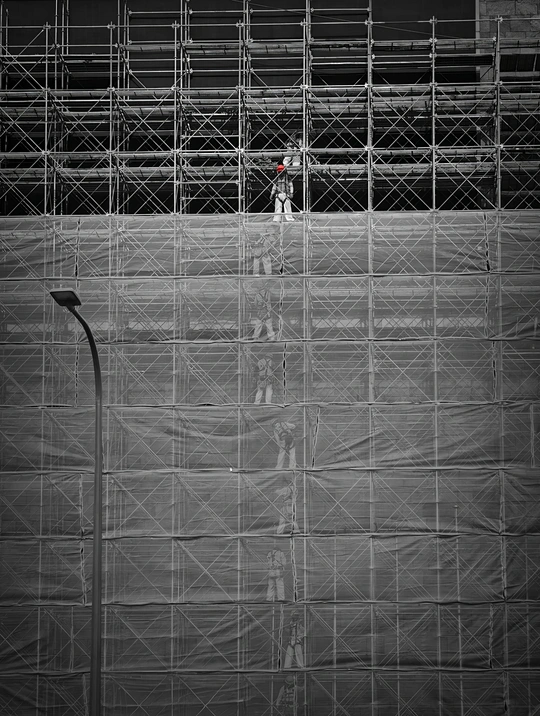 当我按下快门时,被眼前的场景所触动。脚手架如精密的网格,构建出城市建设的骨架,防护网后工人的身影若隐若现,似与建筑共舞。而那抹红色安全帽,像一颗炽热的星,在冷峻的工业图景里闪烁,它是劳动者的勋章,也是我镜头下对城市建设者最深情的注脚,我想留住这份在机械与人力间迸发的、充满生命力的瞬间。