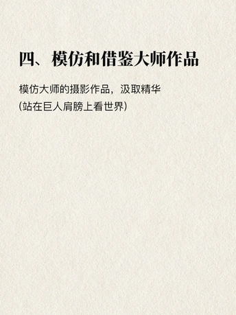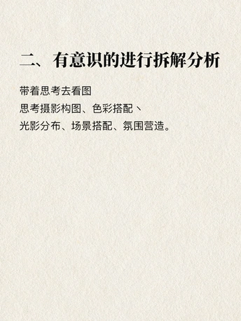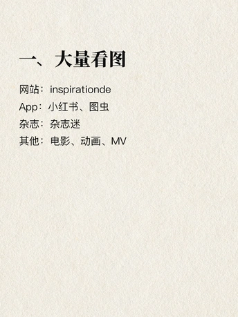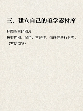 有小伙伴问怎样才能提高照片的质量呢?其实这需要我们不断提高审美,那今天我们就一起学习六个提高审美的方法吧🤗 1、大量看图👀 很多人审美能力差可能就是因为看的少了,在日常生活中我们可以利用碎片化的时间多浏览美图、电影、杂志(在潜移默化中提高审美🌻) 2、有意识的进行拆解分析 在看图时思考🤔: 摄影构图(看整体画面构图的方式是怎样的) 色彩搭配(画面中色系的分布、组合) 光影分布(无观察画面中光影的投射方向) 场景搭配(物体与物体之间摆放位置的关系) 氛围营造(道具与场景的搭配、联系) 3、建立自己的美学素材库 我在平常浏览到好的作品,会保存在相册,同时做好分类。比如摄影作品、审美书籍、氛围生活、光影素材、 配色灵感等。(我也会整理喜欢的电影、动画、MV截图) 积累不是一朝一夕的,所以看到这里就赶紧行动起来吧!建立属于自己的美学素材库。💪💪💪 4、模仿和借鉴大师作品 很多审美博主,一开始也是从模仿开始的。可以先对标自己想要的风格通过记录和刻意练习,掌握一些审美的基本感觉和规律,在渐渐的形成自己的风格。(小伙伴们也可以多看多学习优秀的绘画作品,学习配色,寻找灵感)🌟