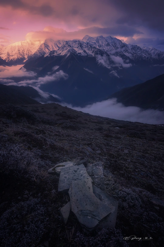 夕阳将最后熔金般的烈烈光芒,毫不吝惜地全部泼洒在雪峰之巅,整座山便燃烧成一座璀璨夺目的金色圣殿,每一道褶皱都在发光……