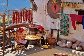 秋阳把日子晒得发烫,辣椒红成串,玉米黄成金,南瓜在墙根堆出憨态的圆。农妇们将柿子的甜、谷物的香、丰收的喜悦,都铺进这方晒满阳光的小院中了。