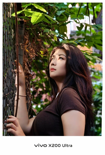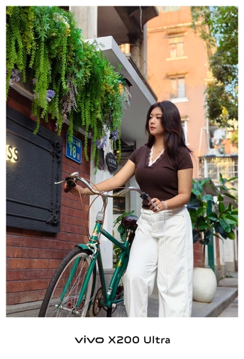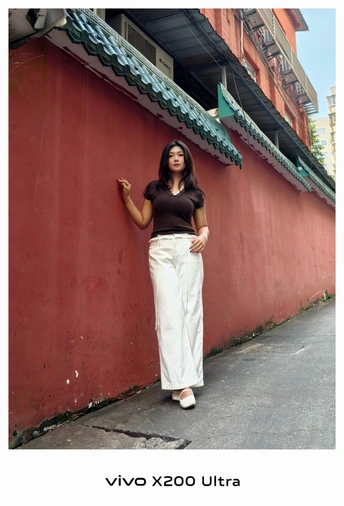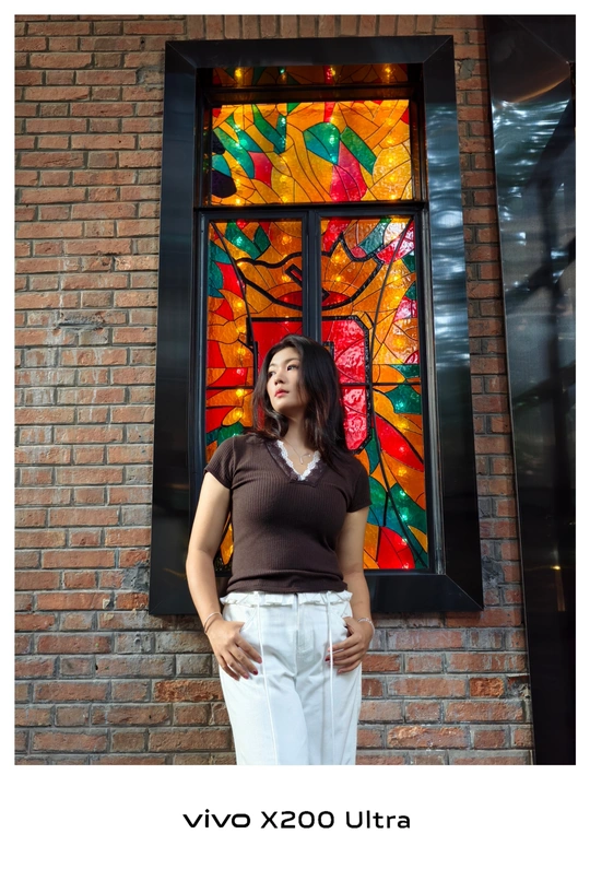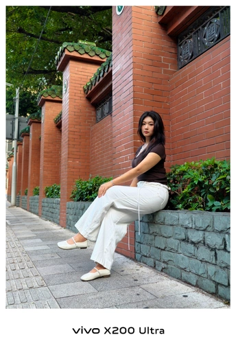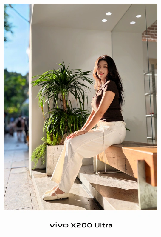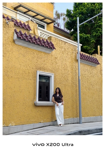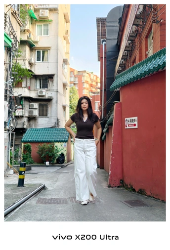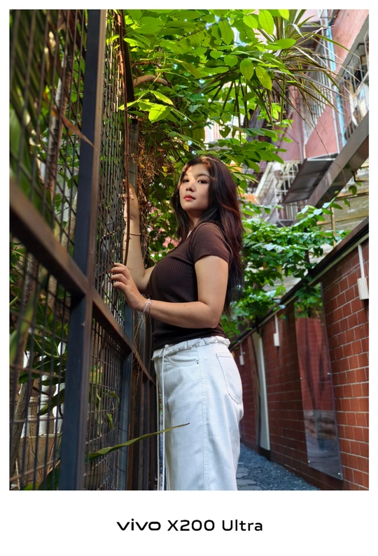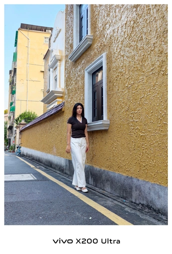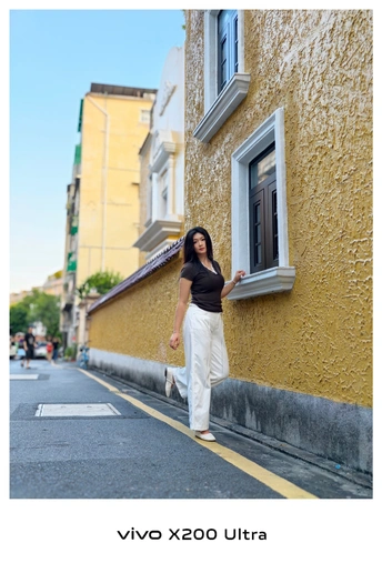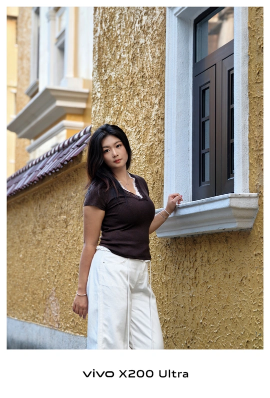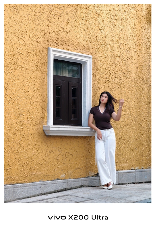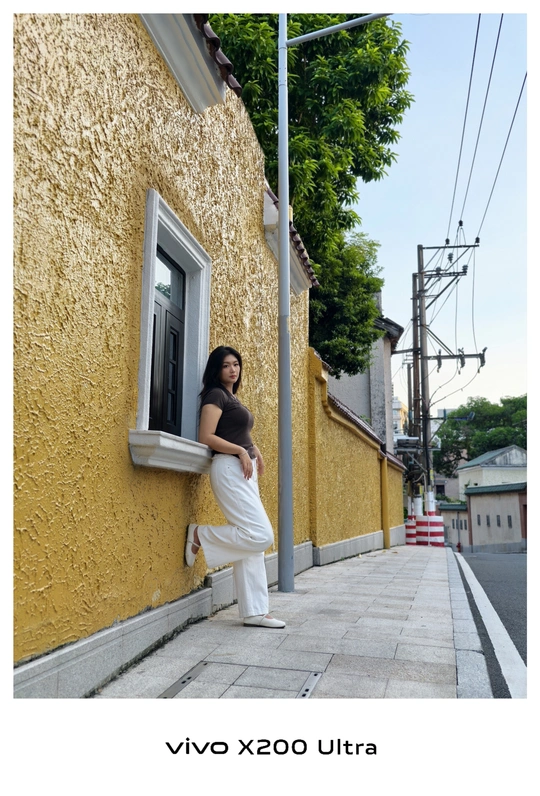 她一身悠闲服装装扮,气质飒爽,在东山口的街道这里的多彩建筑把人物衬托的活力满满。