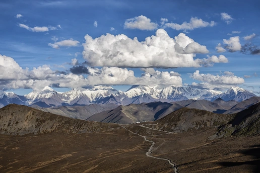 这张高原雪山全景图以开阔构图展现天地大美。采用经典三分法,近景褐黄山地、中景灰棕丘陵与远景雪脉形成清晰层次,S形蜿蜒小路如银线贯穿荒原,引导视线最终聚焦于云端雪冠,构建"人-地-天"的空间叙事。 色彩上呈现强烈对比:靛蓝天空与棉白积云构成明快背景,雪顶的亮白与山体的赭石色形成冷暖对话,云影投射在山峦间的明暗变化增强了画面纵深感。大团积云悬浮如雕塑,与下方延绵的山系形成动与静的平衡。 情感层面传递出壮阔与宁静的交织——浩瀚云阵下的雪山群像彰显自然伟力,而蜿蜒小路又暗含人类足迹,引发对天地浩渺与生命坚韧的双重喟叹。光影处理上,侧光勾勒出山体的硬朗轮廓,雪线处的高光与云隙间的蓝天形成呼吸感。 主题上通过"云-山-路"的三重意象,诠释了自然崇高与人类探索的永恒命题。艺术价值在于将宏大景观纳入有序构图,既保留了纪实摄影的真实感,又通过云层的戏剧性排布赋予画面浪漫主义气息,堪称自然景观摄影中"雄奇"与"灵动"兼备的佳作。 "云涛"状写画面中翻涌的积云如浪涛奔涌,"雪脊"直指贡嘎群峰的银白轮廓;"天开"既呼应云层破开处显露的湛蓝天幕,又暗合"贡嘎"藏语"洁白冰山"之意,更隐喻神山在云海中豁然显现。