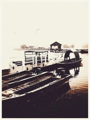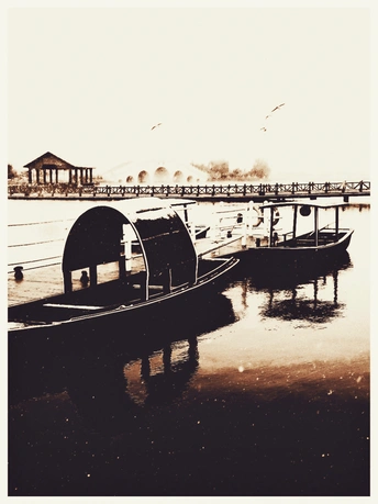 昆明池畔,雪花纷飞,白雾氤氲,水天一色。残荷覆霜,芦苇轻摇,远山隐约如梦。行人稀疏,天地寂然,古意流转于冰寒之间。(2010年11月于西安昆明池)