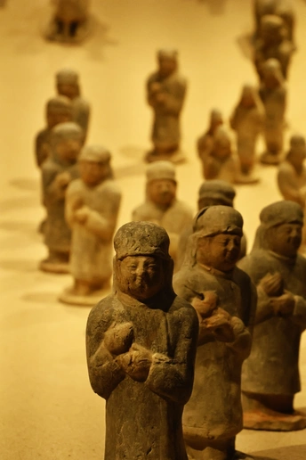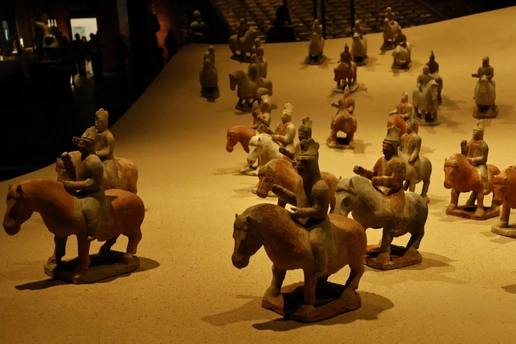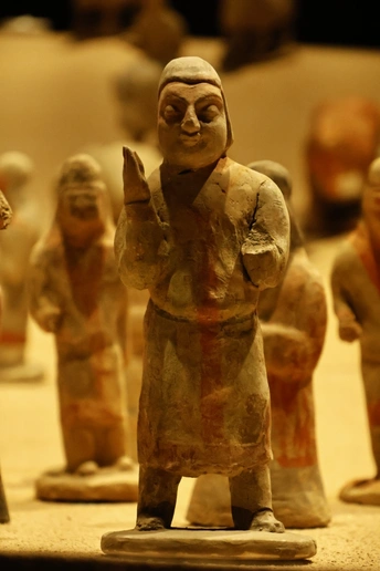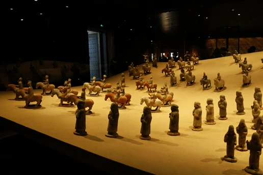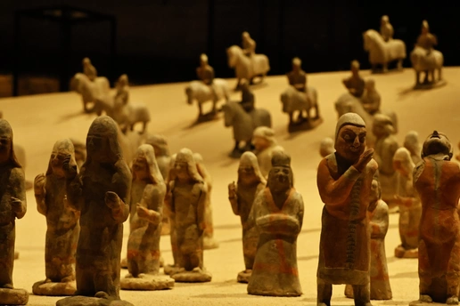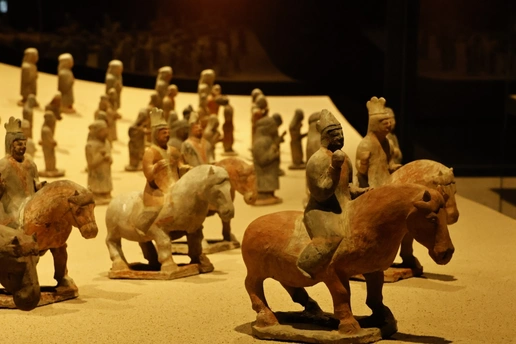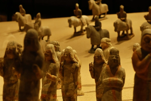 大同博物馆的展台上,北魏陶俑列队成阵——骑吏披赭色衣袍控马前行,侍者拢袖垂首侍立两侧,陶马的鞍鞯裂纹里裹着平城旧尘。 这些指尖捏塑的泥胎,曾是鲜卑贵族的仪仗缩影,如今在展灯里站成了北魏的风。