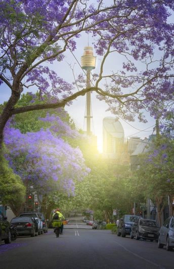 悉尼的蓝花楹花季已到,我提起相机来到市中心,寻找蓝花楹的踪迹,抬头看去悉尼塔在花簇中隐隐可见,于是我举好相机等到了一张外卖员、悉尼塔和蓝花楹的合照。