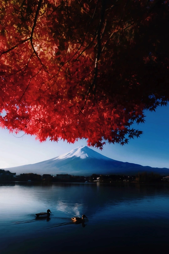 湖水如镜,静静映着雪顶的富士山。红枫似火,在清晨的光影中燃烧着秋意。两只鸭子轻轻划过水面,涟漪荡开,如同时间被柔和地推向远方——这一刻,天地之间只剩宁静与美。