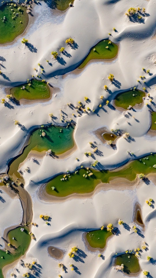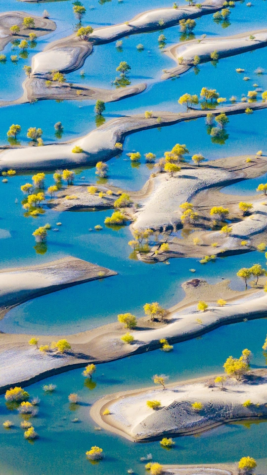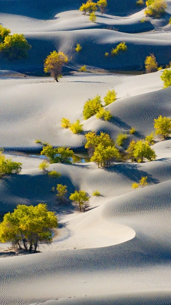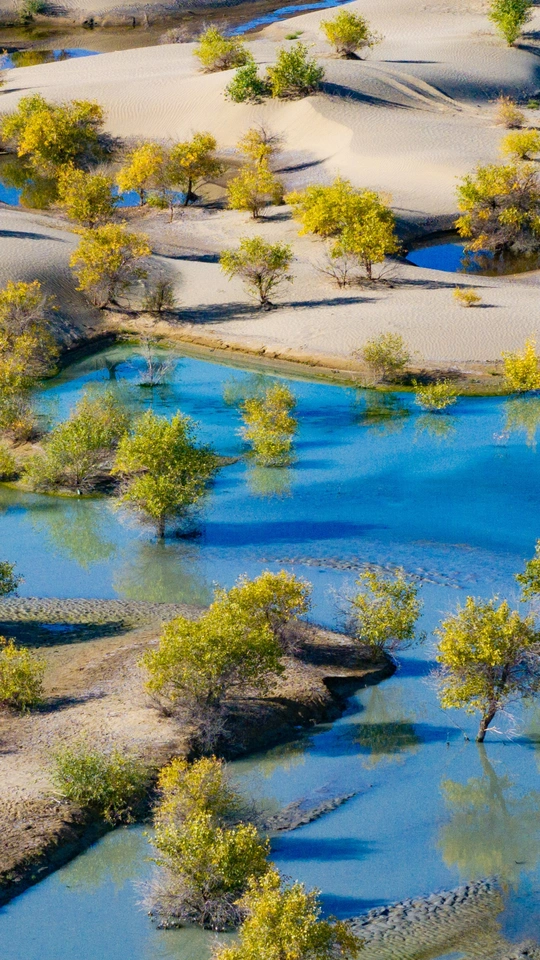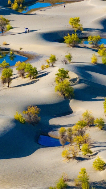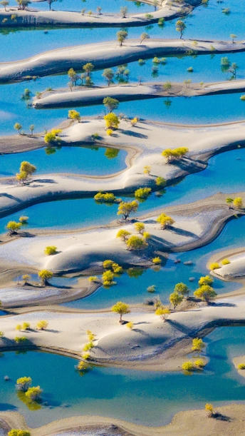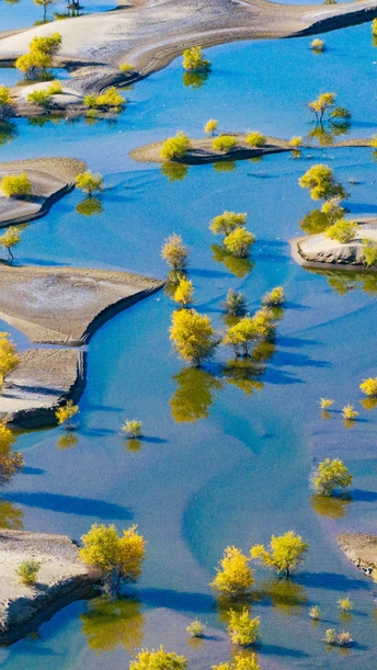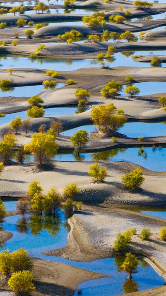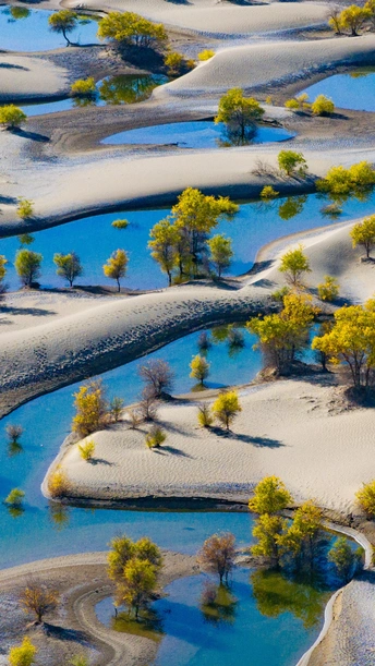 在新疆和田色格孜库勒乡翡翠湖,蓝色的水、金黄的胡杨、起伏的沙丘交织映衬,形成美丽独特的景观。
