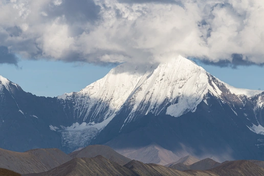 这幅雪山云景图以经典的三分法构图构建视觉秩序:画面上部三分之二被翻涌的积云占据,棉絮状云团如奔腾的雪浪,下部三分之一则由层次分明的山脉构成——近景赭黄丘陵、中景灰褐山峦渐次过渡到主峰的皑皑白雪,形成纵向空间的递进。主峰峰顶恰好处于黄金分割点,云层在此处形成天然的环形光晕,使雪山如悬浮于云海中的神圣存在。 色彩上呈现高度凝练的冷暖对话:铅灰云团与湛蓝天空构成上部的冷色调区域,而主峰的冰雪在阳光下泛着珍珠白光泽,阴影处的靛蓝与山脚岩石的赭石色形成微妙过渡。云层边缘的银灰色高光与雪山阳面的暖白形成材质对比,展现出大气对光线的柔化作用。 情感层面传递出肃穆与敬畏:厚重云层的压迫感与雪山刺破苍穹的挺拔形成张力,光影的瞬息万变(云影在雪坡上移动的痕迹)暗示永恒中的瞬间,引发观者对自然伟力的崇高感。这种情感并非激烈的冲击,而是如山脉般沉静的震撼,带着高原特有的空寂与庄严。 主题上直指"神圣地貌"的视觉叙事:通过云与山的动态关系,具象化"天地交合"的东方宇宙观。主峰作为视觉焦点,既是地理制高点,也是精神图腾,其冰雪覆盖的永恒性与流云的瞬息万变形成时间维度的对话,暗喻自然的不朽与无常。